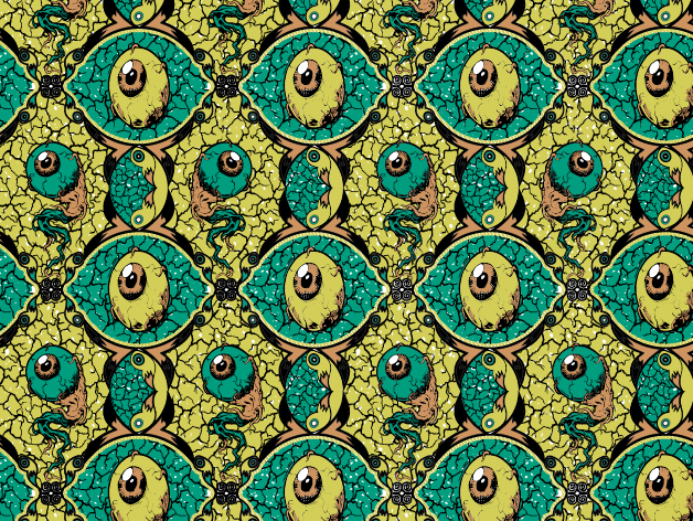 All Eyes On Me is a surreal repeating pattern associated with a product line called “Eye Scream Monster Ice Cream”. It is a captivating, horror-themed illustration with three key elements. First, large creepy eyeballs with eerie yellow-green irises set within a teal, cracked outline. Second, mutant shapes resembling melting ice cream cones or distorted monsters with eyes, potentially representing “mutant” ice cream. Third, a color palette dominated by vibrant unsettling greens, and teals, contributing to its bizarre and eye-catching appearance, as well as a cracked yellow background providing texture and contrast to the main elements. This playful design is sure to thrill and chill!