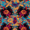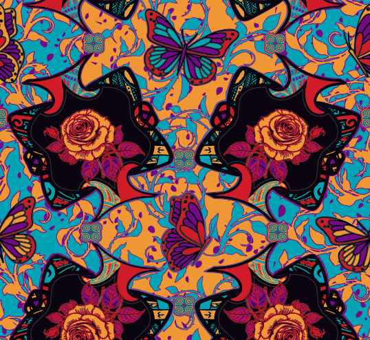 Butterflies and Roses is a vibrant, psychedelic seamless pattern that fuses natural beauty with bold graphic expression. Stylized roses and butterflies form the core imagery, their organic shapes reimagined through strong outlines reminiscent of neo-traditional tattoo art or pop aesthetics. Prominent yellow and orange roses sit at the center, glowing with warmth and energy, while intricate black forms surround them. These dark shapes, inspired by baroque and Chinoiserie motifs, weave in additional floral and leaf details, creating a sense of ornate complexity. Mirrored across the design, they establish a repeating rhythm that feels both structured and dynamic. The result is a layered composition where nature, symmetry, and bold color converge into a strikingly modern yet timeless visual language.